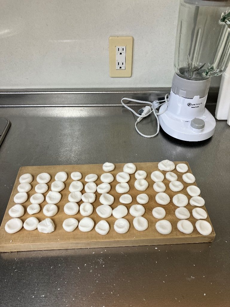 すぐにだんご粉・水を量り入れ、3人分程に分けて必死にこね始めました。目標は耳たぶくらいの柔らかさです。こねつつ、鍋の水がお湯になるまで沸騰させつつ、同時進行で行っていきました。その間、料理係のメンバーの1人は時間がない!と焦っていましたが、大丈夫!!という気持ちで行っていきました。約20~30分程こねまくりました。大切なのは、一つにまとめて、ぐっとつぶして押し込みながら混ぜるのがコツです。こねていく中でちょっとしたトラブルもありましたが、最終的には解決しました。しばらくみんなで粉をコネコネして、耳たぶくらいになってすぐにお湯が沸騰してきたので、一口大の大きさに丸めていきました。ココの丸めていくのは、手先で丸めていくとキレイな正丸になります。逆に手の平で丸めると形がいびつになるので、手先がオススメです。その後、指でフニッと少しつぶしてからお湯に入れまくり、約1分すると、少しずつ白玉がプカプカと浮いてきます。全て白玉が浮いてきたら、すぐにお玉で氷水に入れ冷やし、すぐに皿に1個ずつのせていき、ラップをかけて冷凍庫に入れました。