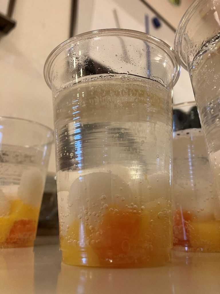 パエリアができるまでに時間がかかったため、急遽デザートから食べることになり、スピードを要する中、係ではない方も含め数人で具材を分け入れました。テーブルに並べた30個のコップに淀みなく各々の担当する具を入れていき、あっという間にフルーツポンチになっていきました。当日協力頂いた方ありがとうございました!