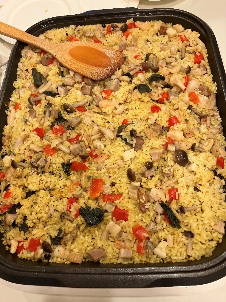 孫娘の手を借りパエリアが完成。色といい香りといい具沢山の見た目といい、美味しいに決まっている。試食すると濃い味付けで個人的には好き。他の人にも好評で、無事に長男の嫁としての役割を果たせたことに一安心。