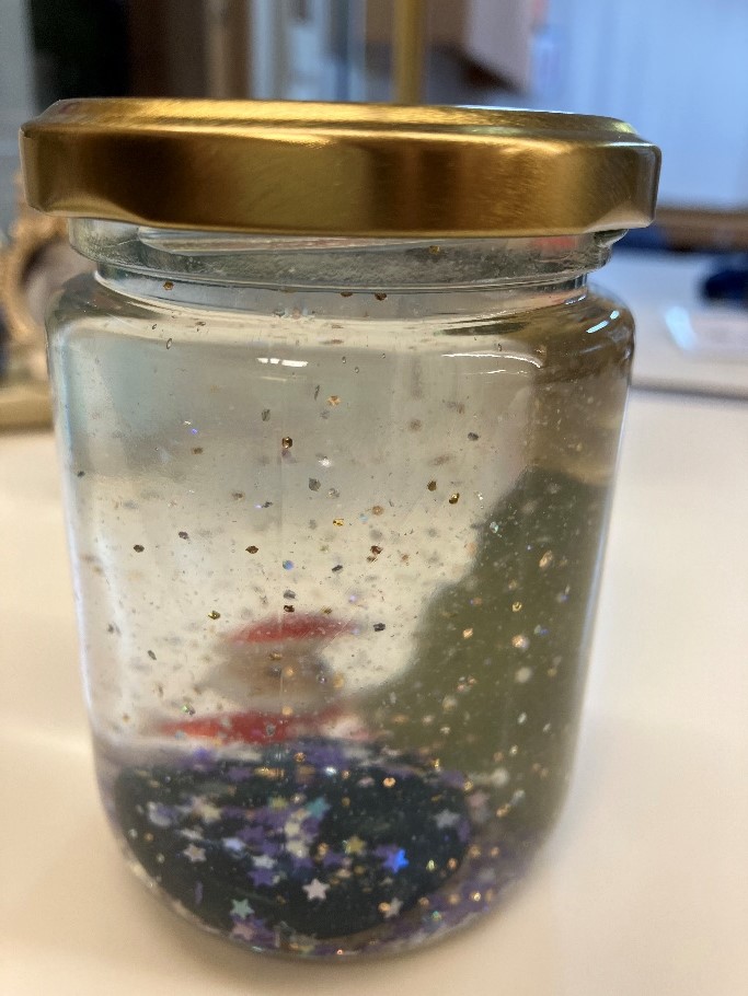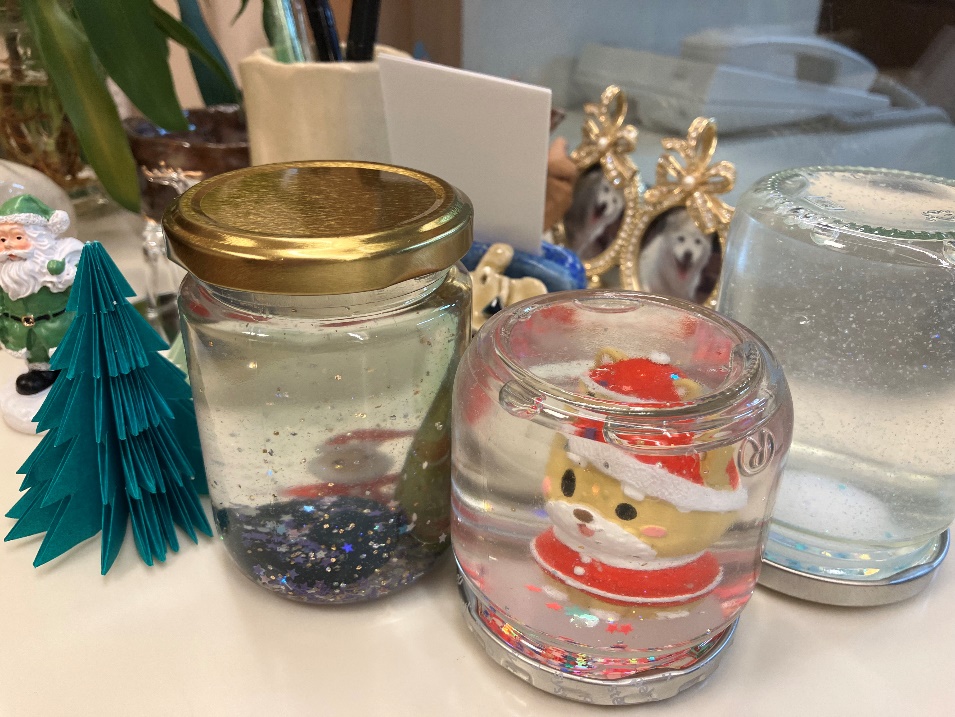 「接着にどのくらいの時間かかるかな、それにもよるよね」「接着している間に何かやりましょうか」とスノードームを作ってみることに。