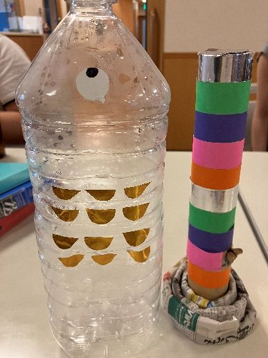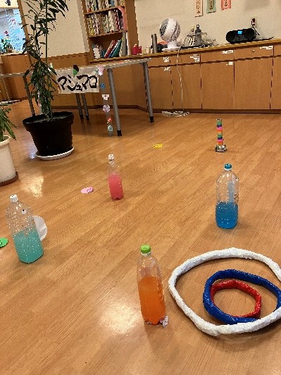続いて輪投げの準備。手作りで作れるものでペットボトルを的とし、新聞紙を細長く丸めて輪っか状にしたものを輪にするというアイデアがインターネットに!それを採用することに。その後、製作を皆で行う中で、様々な大きさの輪が生まれたため、使用する輪の大きさごとに点数を変えようというナイスな思い付き。偶然の産物であったが当日の難易度にも活きることに!