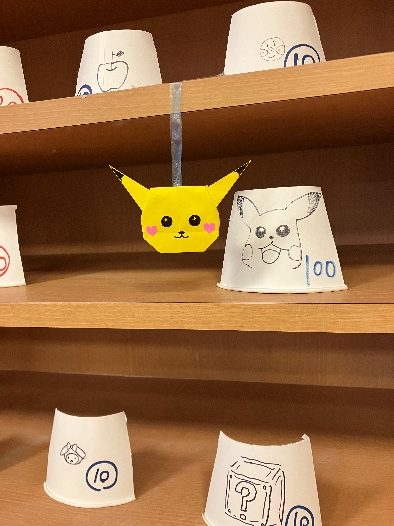 3~4丁作る事に。会場は陶芸を置いている棚。的は紙コップに点数を記したものを。ワナとしてマイナス点の的も。