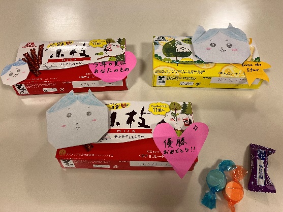 ゲーム終了後には、チームの点数が一番高いチームに景品としてお菓子が3つ贈呈されました。他の方々にも参加賞としてお菓子を配りました。